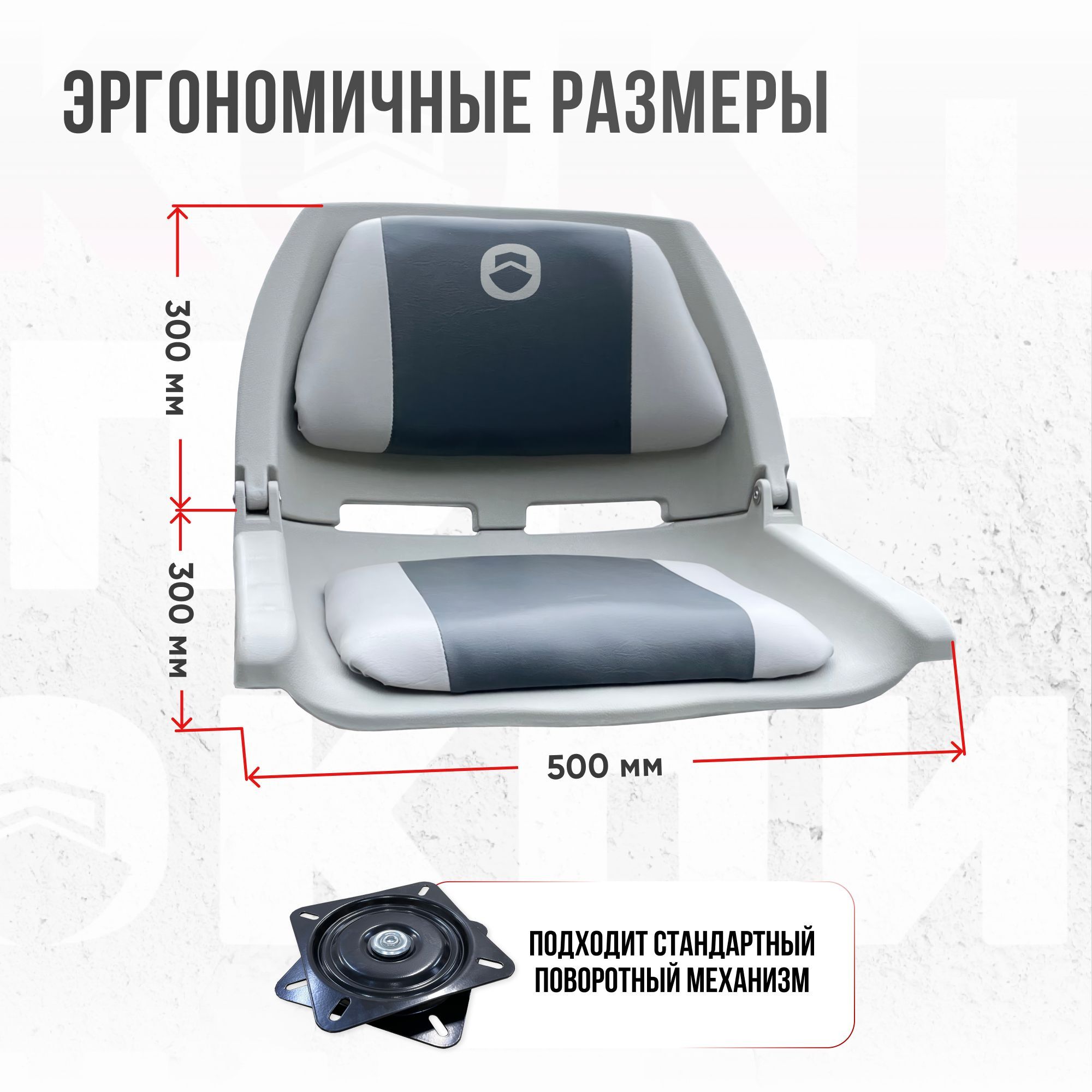 - Ширина сиденья в лодку – 50 см, высота – 40 см, глубина по габариту – 48 см, глубина посадочного пространства – 43 см.