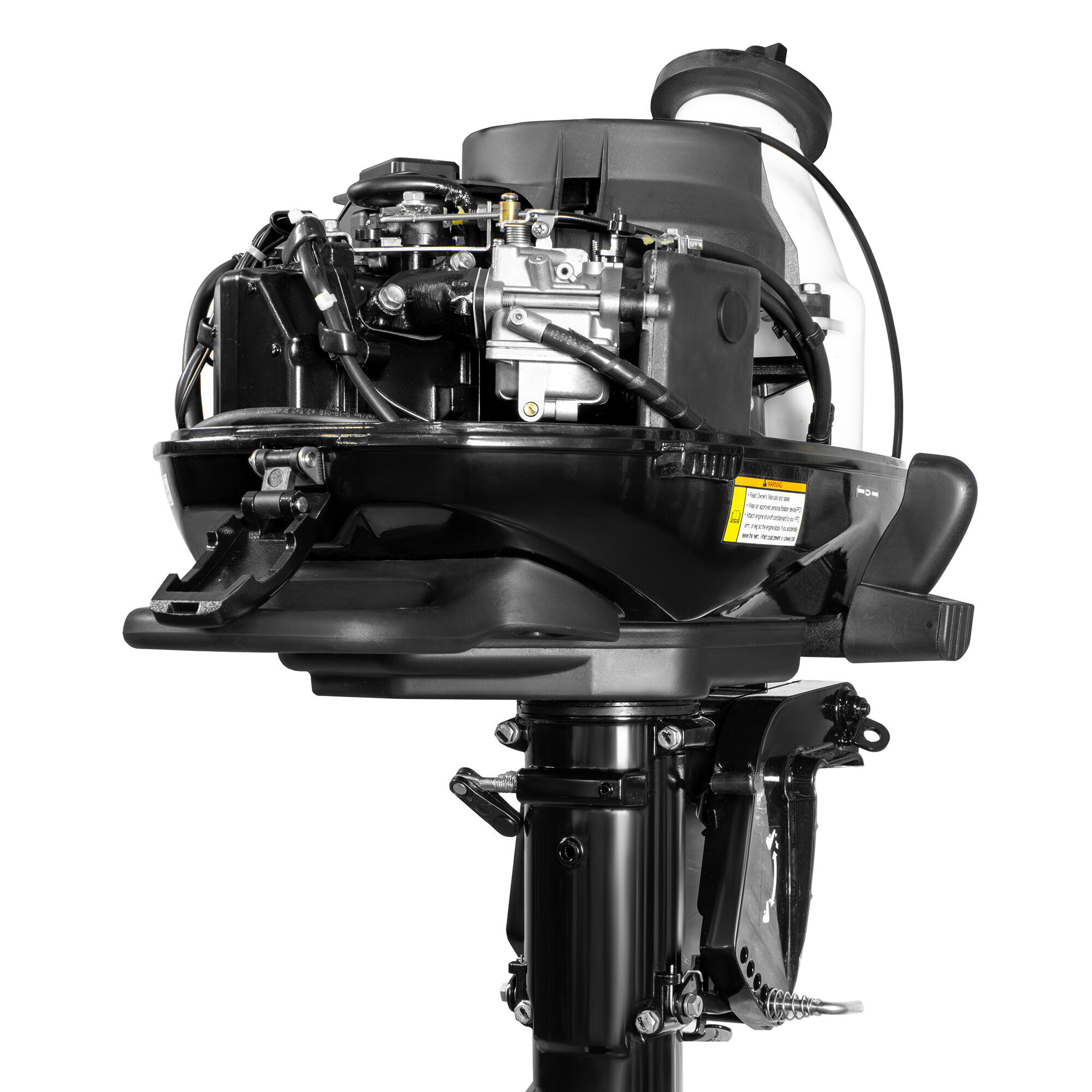Мотор имеет румпельное управление. Подача газа осуществляется с помощью ручки на румпеле. Двигатель запускается вручную. Мотор может поворачиваться на 180°, это позволяет комфортно совершать разные маневры и разворачиваться на скорости. Швартоваться или отчаливать удобно, так как коробка передач имеет 3 направления: переднее, нейтральное, заднее.